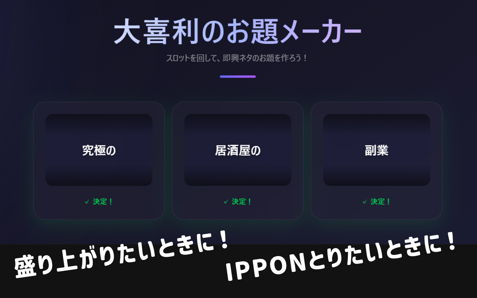 スロットを回して大喜利のお題を生成できるツールです。盛り上がりたい時や頭の体操にも?おすすめのお題ジェネレーターです。