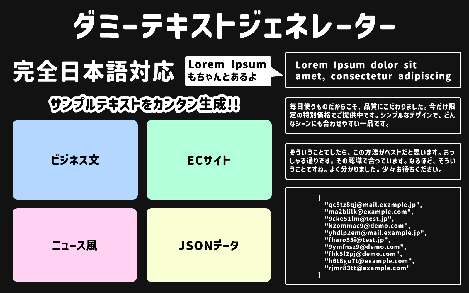 Web制作・デザイン用の日本語ダミーテキストを簡単生成。ビジネス文・ニュース風・会話文など用途別テンプレート付き。