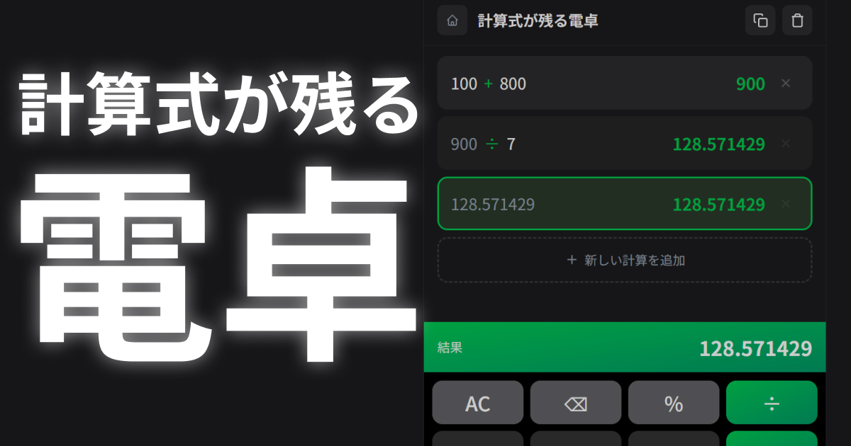 計算式を履歴として残せる電卓。連続計算に便利で、結果を次の計算に引き継げます。キーボード入力・コピー機能付き。