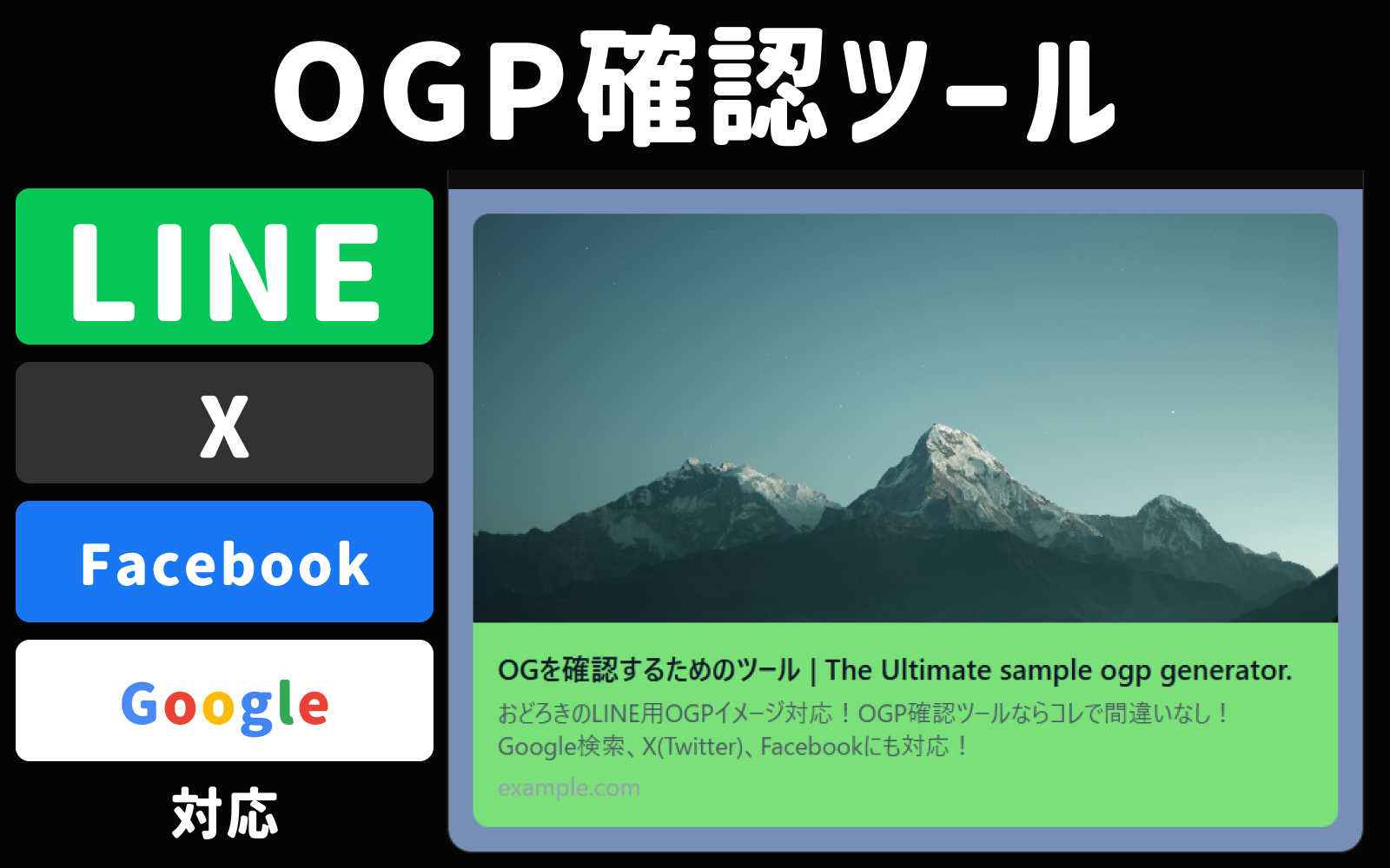 OGPタグのプレビュー表示とコード生成。Google検索・X・Facebook・LINEでの見え方を確認してコピペで使えます。